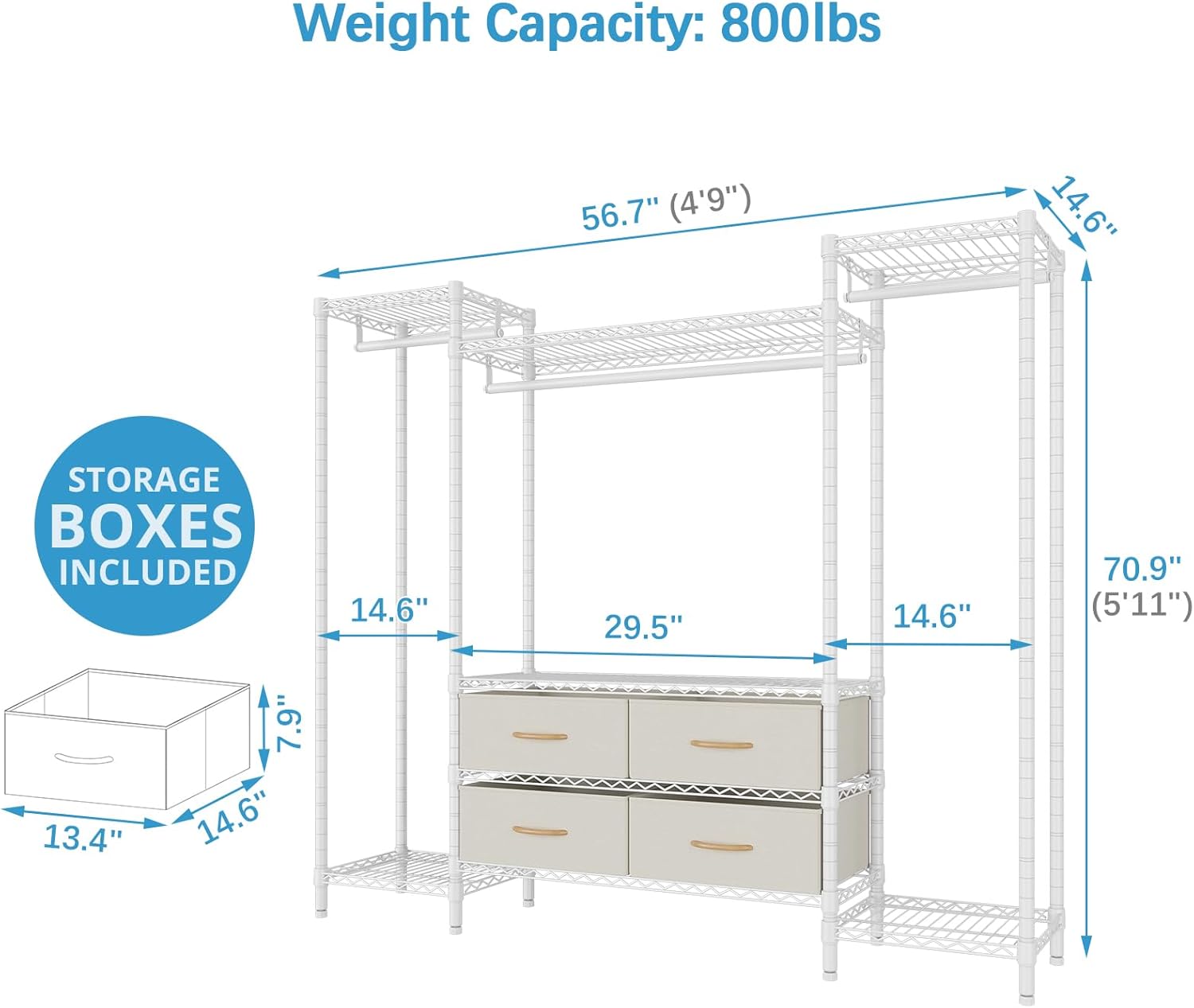 - Dimensions & Load capacity : 56.7" L x 14.6" W x 70.9" H. Load capacity up to 800 lbs. Single hanging rod can support up to 75 lbs, Wire shelf can support up to 88 lbs for each.