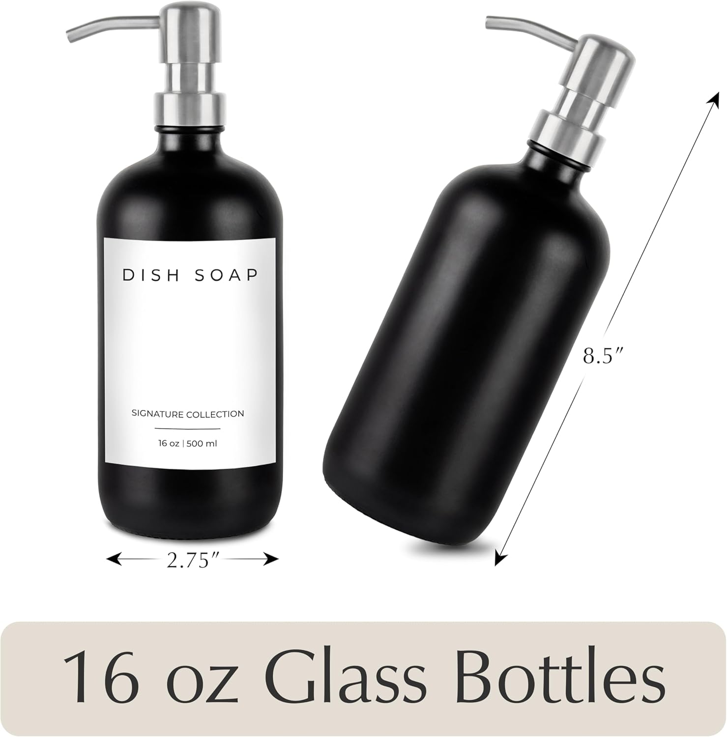 - ✅ 2-in-1 COMBO: Upgrade your home with our glass soap dispenser set. The dish soap dispensers are crafted from the highest quality glass and can be used as soap dispensers for kitchen sinks, soap dispensers for bathrooms, or as hand soap dispenser of your favorite liquid. The kitchen soap dispensers come with 2 dish soap dispensers for kitchen bottles (16 ounces), 2 stainless steel pumps, and 5 waterproof labels. Our selection includes colors including amber, clear, white, and black.
