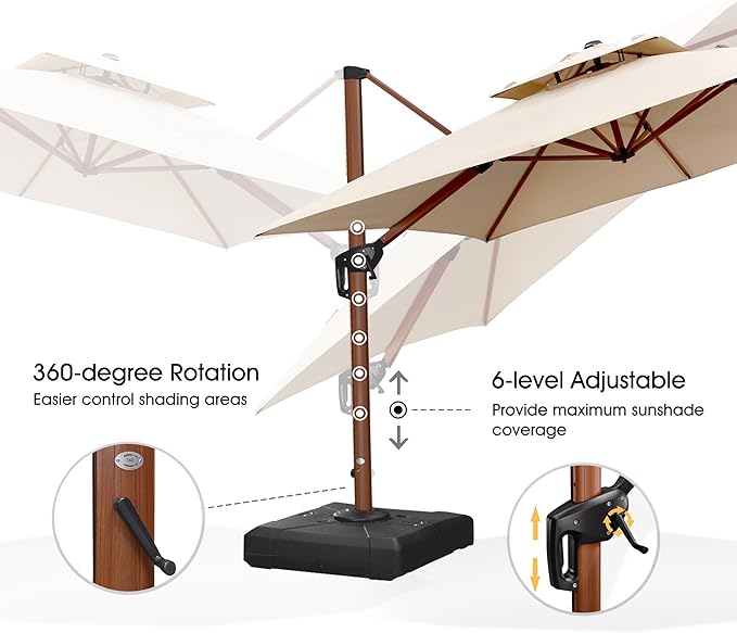 - Large area shade: The size of this patio umbrella is 9' X 9', unique handle design and crank system, 6 height and angle to choose, 360 degree rotation for easier shading area control