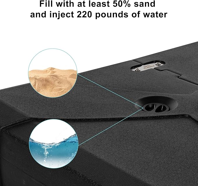 - Fill at least 50% with sand and completely fill with about 220 Lbs of sand and water