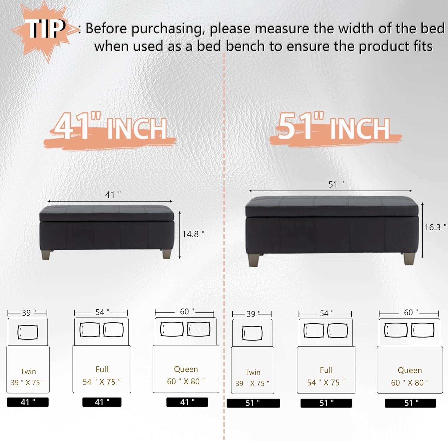 - OVERALL DEMENSION: The overall size of UDAX faux leather ottoman is 41β*15.5β*14.8β and the inside storage dimension is 38.5β*12.5β*7.5β. Our storage bench is wide enough to sit cozily and large enough to store your blanket, clothes, children's toys, and so on. It has plenty of space to help you organize every corner of your home.