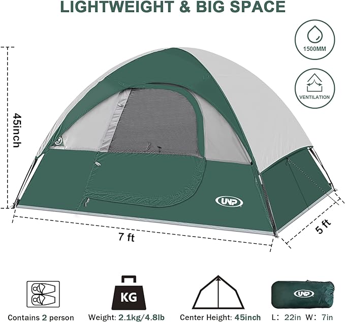 - Lightweight & Big Space: 7'L x 5' x 45"H. Spacious room for 2 adults.Standard size fits 1 full air mattress.And this 2 Person tent weighs just 4.8lb,it's very easy to carry.This tent perfect for outdoor camping, hiking,climbing,indoor or backyard play tent, fishing, or shelter at the beach in all weather.