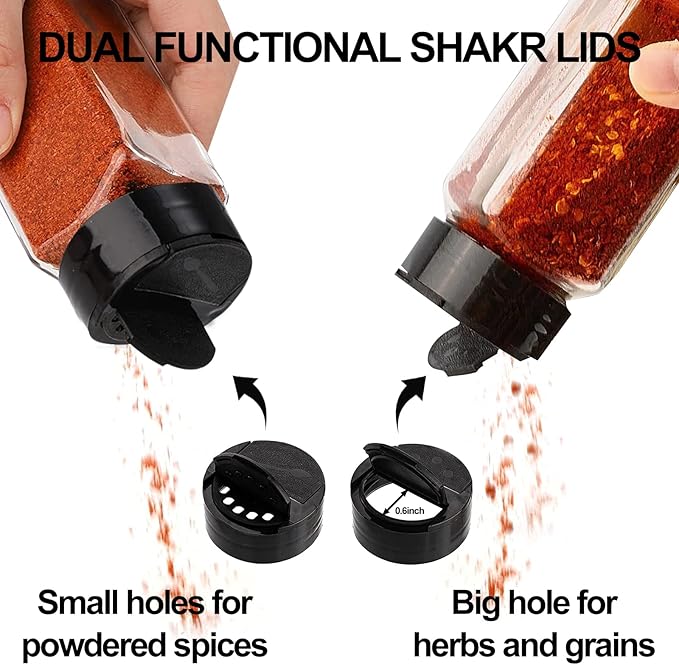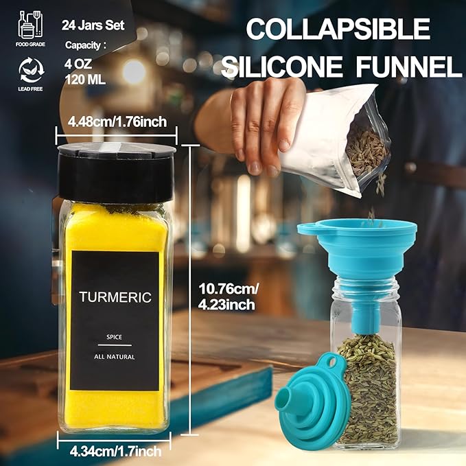- 【Premium Accessory】Silicone funnels make it easy to fill your spices. 300 preprinted labels for common spices, 60 expiration dates and 38 blank labels for you to fill in with a marker as needed. The black lid is a two-sided flip cap that can be used without unscrewing the cap, perfect for shaking or pouring spices.