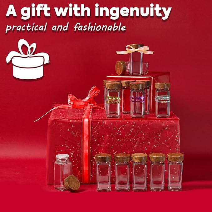 - 【EASY STORAGE】Each square glass spice jar is 4.1" x 1.74" in size with a 1.4" diameter spout.The square shape and round top reinforce the stability of the spice jar, suitable for any spice rack, cabinet, organizer, drawer or kitchen table.Can also be put directly into your bag to carry, the first choice for picnics, camping, outdoor barbecues, hiking, etc.These spice jar containers also serve as housewarming or birthday/daily/Thanksgiving/Christmas/New Year gifts.