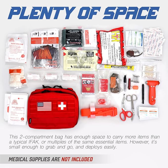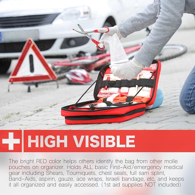 - OPEN FLAT TO QUICK ACCESS: Molle IFAK Pouch's main compartment can open flatly to let you work in a desk setup, you can hold in any position with the edge-to-edge retention cord. Two side retention straps for quick access to the pouch without full-opening