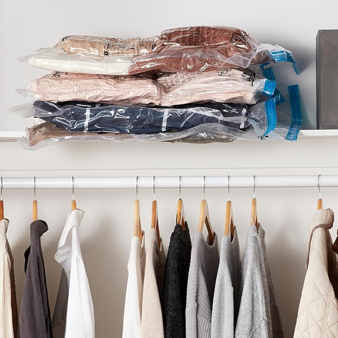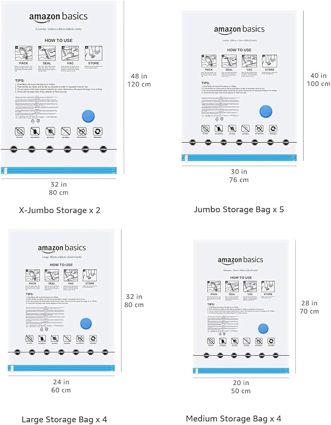 Amazon Basics Vacuum Compression Space Saving Storage Bags with Hand Pump for Travel, Multiple Sizes for Clothes and Blankets, Clear, 20 Pack (5 Small, 5 Medium, 5 Large & 5 Jumbo)