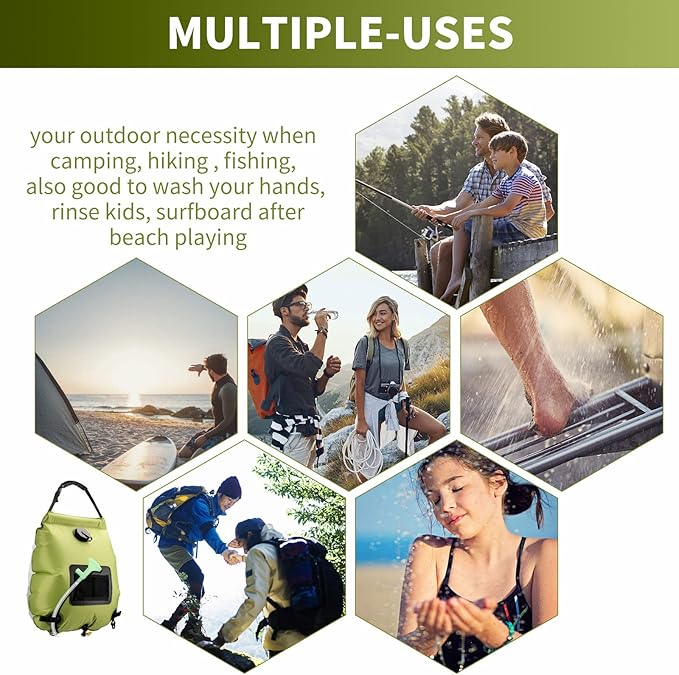 - WIDE RANGE OF USES - This camping showers is suitable for outdoor activities such as camping, backpacking, hiking, fishing or hunting, our portable shower bag is one of the indispensable outdoor equipment accessories for you and your family.It is also the best gift for Father's Day and the perfect camping accessory for men your husband and your children.