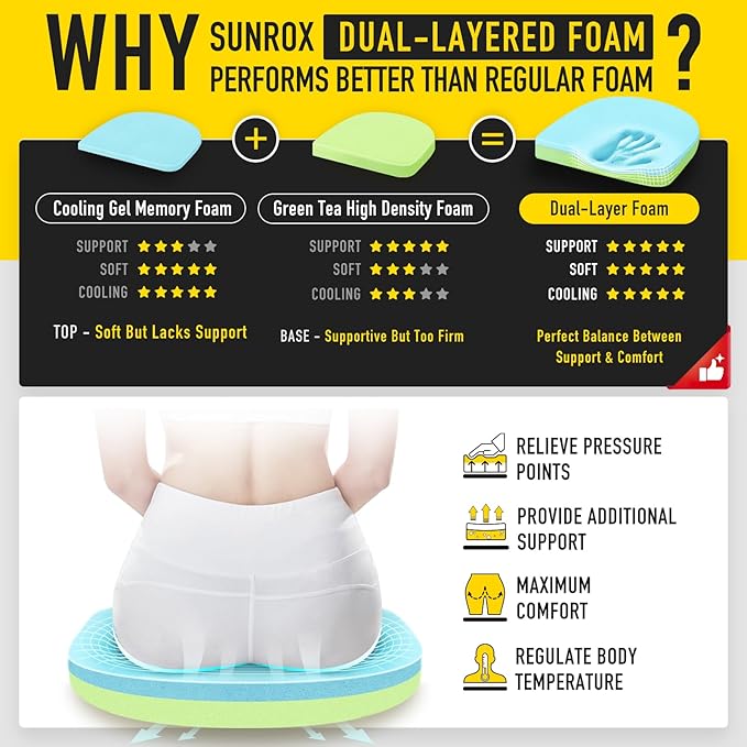 - 【Unique Double-Layered Interior Foam】Cooling gel memory foam combine with green tea high density foam, gel infusion regulates body temperature, providing a cooler temperature than traditional memory foam, ultimate comfort even during long hours of setting. Refreshing green tea infused into pressure-relieving high density foam that provides long lasting exceptional support, by evenly distributing weight of the body to reducing pain and fatigue in your lower back, hips and sciatic nerve.