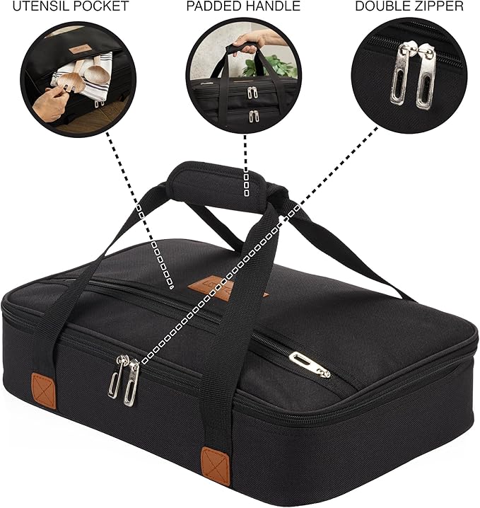 Stack Store Plus More Black Insulated Casserole Carrier for Hot or Cold Food, Lasagna Holder for Picnic, Potluck, Cookout – Fits 9”x13” or 11”x15” Baking Dish – Thermal Tote