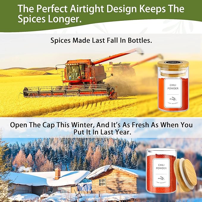 - SEAL DESIGN: The glass spice jars with bamboo lids are solid and airtight. Each seasoning containers have a seal bamboo lid that doesn't require screwing. The tops of the airtight spice jars have a rubber seal connected to the bamboo. The spice jars with bamboo lids can keep moisture out and keep the spices fresh and dry. PLZ NOTE: please keep the lids dry, Do Not place them in a damp or wet place. If the bamboo lids get wet with water, please let them dry.(Not recommended to put the lid in the microwave).