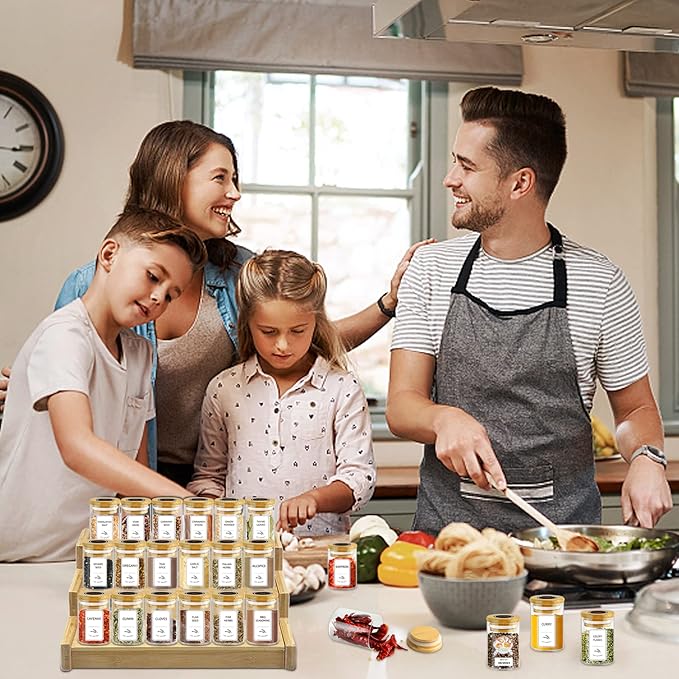- SPICE JARS WITH LABEL: The spice jar set has four kinds of labels, the pre-printed spice labels can be attached to the wood lids and spice containers to help you identify the spices from multiple directions. The date labels can remind you of the expiration date of the spice. And the colorful DIY stickers in the spices container set can make your jars cuter, the spoon can help you get out spices easily. These spice jars and accessories with aesthetic design will make your kitchen stylish and tidy