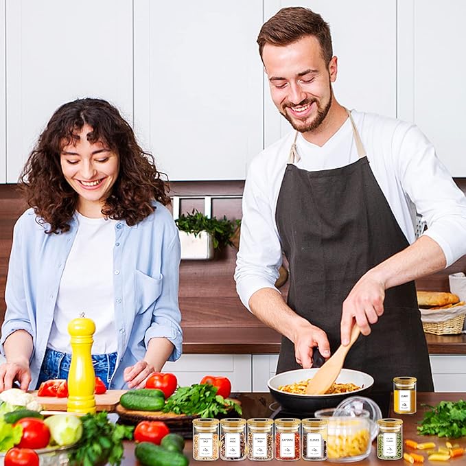- MULTI-FUNCTIONAL: The glass spice jars with bamboo lids are not only used for storing spices, you can also use jars to store herbs, snacks, nuts, candy, tea, seeds, buttons, etc. The spice jars can be placed in your kitchen, cupboards, pantry, spice rack, desk or handbag to help you keep all kinds of items. These 4 oz spice jars will make your life simply and convenient. These modern spice jars with label can also be a present for your friends and families, which will definitely win their love.