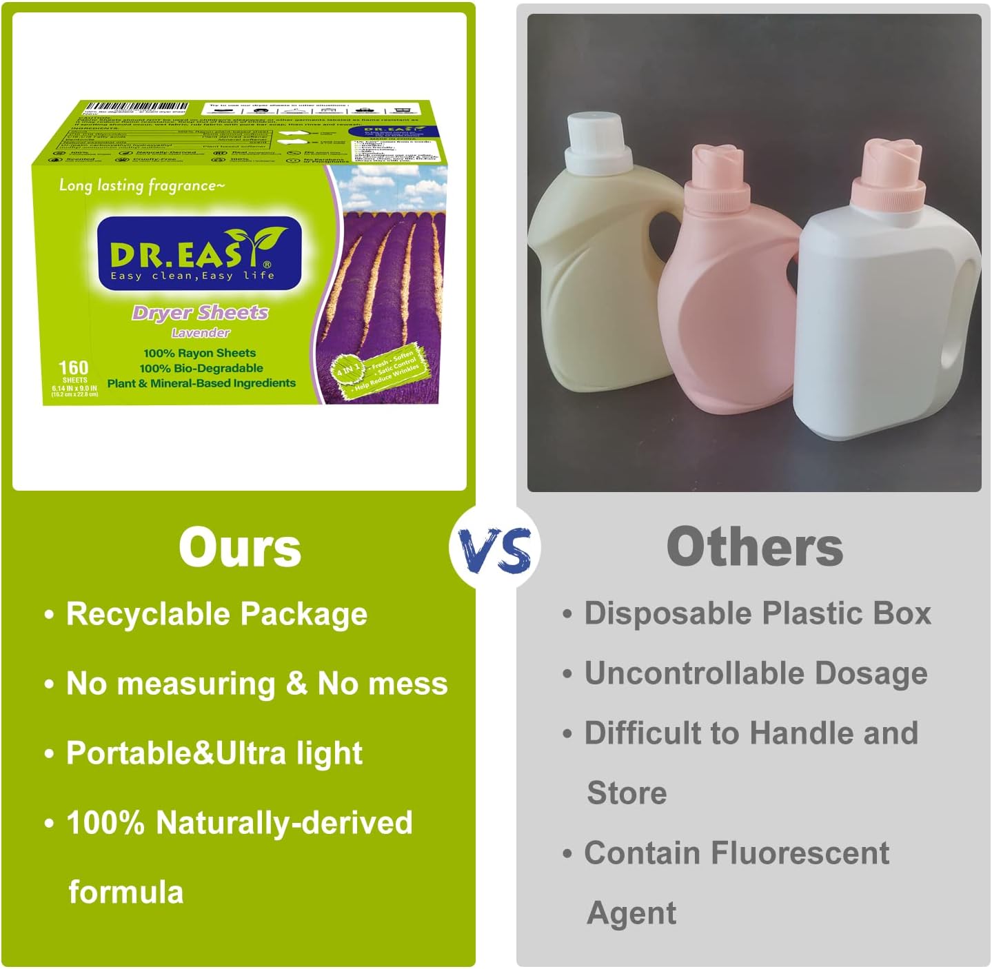 Dr.Easy Dryer Sheets Lavender Plant Based all ingredients for Sensitive Skin 160 Ct 100% Rayon Fabric Softener sheet for laundry No Dyes Reduce Static & Wrinkles Soften Clothes Help Repel Pet Hair