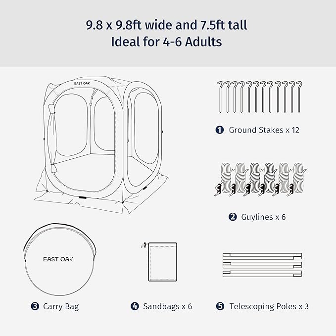 - ๐ฃ๐ผ๐ฝ-๐๐ฝ ๐ณ๐ผ๐ฟ ๐๐ฎ๐๐ ๐ฆ๐ฒ๐ ๐๐ฝ ๐ฎ๐ป๐ฑ ๐ฆ๐๐ผ๐ฟ๐ฎ๐ด๐ฒ: Suitable for 4-6 people, EAST OAK portable screen house features a convenient pop-up design that allows for easy installation by a single person in under one minute. The tent is designed to be easily folded and has a convenient carrying bag. Packed away in its included carry case, its dimensions measure a coimpact 30.7x3.9x30.7 inches