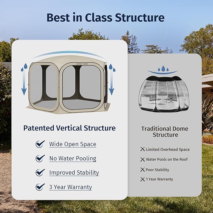 - ๐๐ป๐ท๐ผ๐ ๐ฌ๐ผ๐๐ฟ ๐ข๐๐๐ฑ๐ผ๐ผ๐ฟ ๐๐ถ๐ณ๐ฒ: Creating a more comfortable and mosquito-free outdoor space is easy with our EAST OAK screen house. It has a hook on the top to hang a lamp, and a light strip can be wrapped around the edge to increase the brightness for use on the darkest nights. Day to night, this is an absolute must-have for the patio, camping, picnics, parties, backyard, deck, and even kids' parties! NOTE: Pendant lights need to be purchased separately