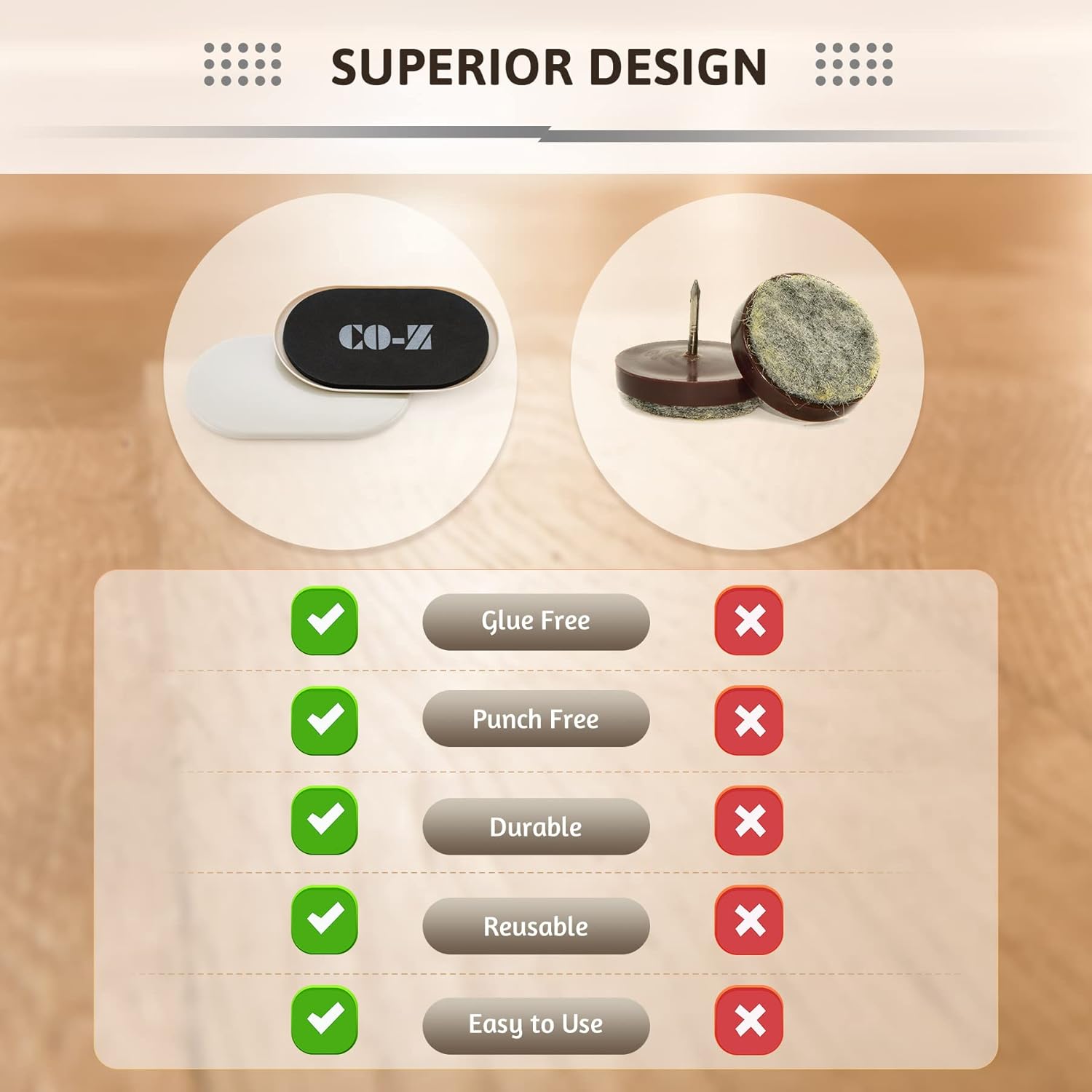 - 8-PIECE MOVING KIT: CO-Z's oval furniture slider kit supports up to 110 pounds, helping you easily move large heavy furniture across your flooring; measuring 5.7x9.4 in., our pads work with most furniture legs, including chairs, beds, cabinets, & more