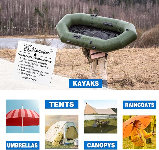 - WIDE APPLICATIONS: Suitable for repairing small slits or fix a leak on air bed, inflatable decorations, inflatable water slide, swimming pool, bounce house, inflatable kayak, inflatable boat, inflatable raft, above ground pool, pool tube, pool float, inflatable ride-ons, inflatable sofa, balloons, inflatable toys, and other inflatables, and can also be used to repair tents, canvas, rain wear, Umbrella and vinyl furniture. bring you much convenience.