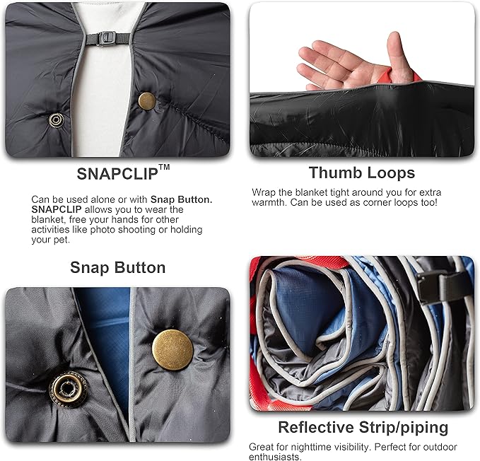 - π― WEARABLE LIKE PONCHO LINER π― The distinguished SNAPCLIP allows you to wear the blanket, free your hands for other activities like photo shooting, preparing food, holding your pet while staying warm. The Snap Button is a surplus and more convenient.