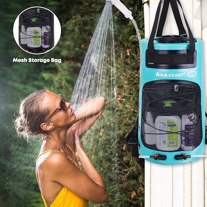 WILD HEART Camping Shower 22L/ 12L Portable Shower for Camping with Pressure Foot Pump and Hose - Solar Shower Bag Backpack for Camping, Road Trip & Outdoor Use