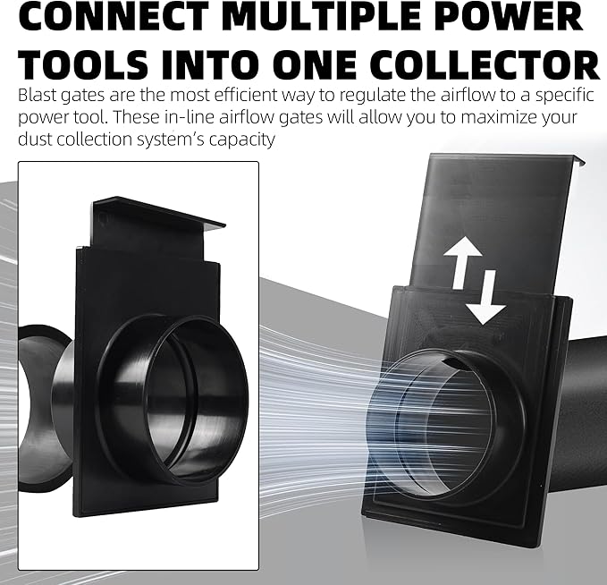 - CONNECT MULTIPLE POWER TOOLS INTO ONE COLLECTOR - Blast gates are the most efficient way to regulate the airflow to a specific power tool. These in-line airflow gates will allow you to maximize your dust collection system’s capacity