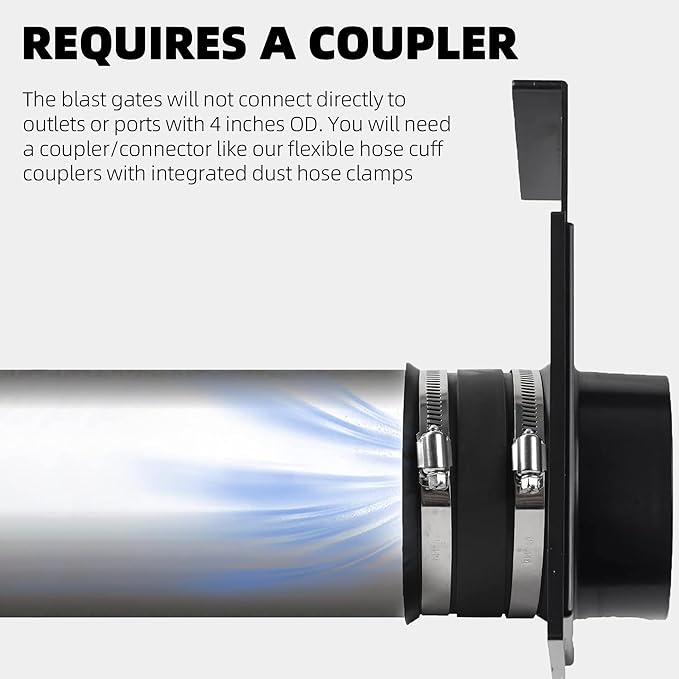 - REQUIRES A COUPLER - The blast gates will not connect directly to outlets or ports with 4 inches OD. You will need a coupler/connector like our flexible hose cuff couplers with integrated dust hose clamps