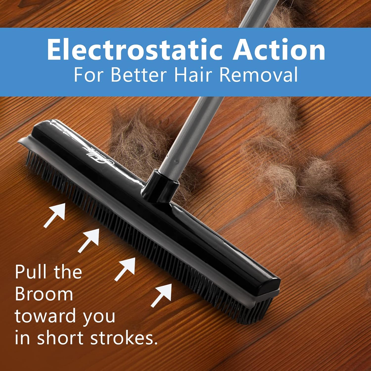 - ELECTROSTATIC ACTION GATHERS HAIR: Unlike other brooms that can cause hair to flyaway, electrostatic action created from short strokes of the rubber bristles (when PULLED toward you) causes pet hair, lint and fuzz to accumulate for easy removal.