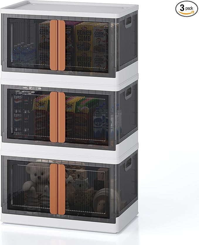 19Gal Collapsible Storage Bins with Lids & Wheels - 3 Pack Stackable with Doors, Heavy-Duty Plastic Containers for Home/Office, White