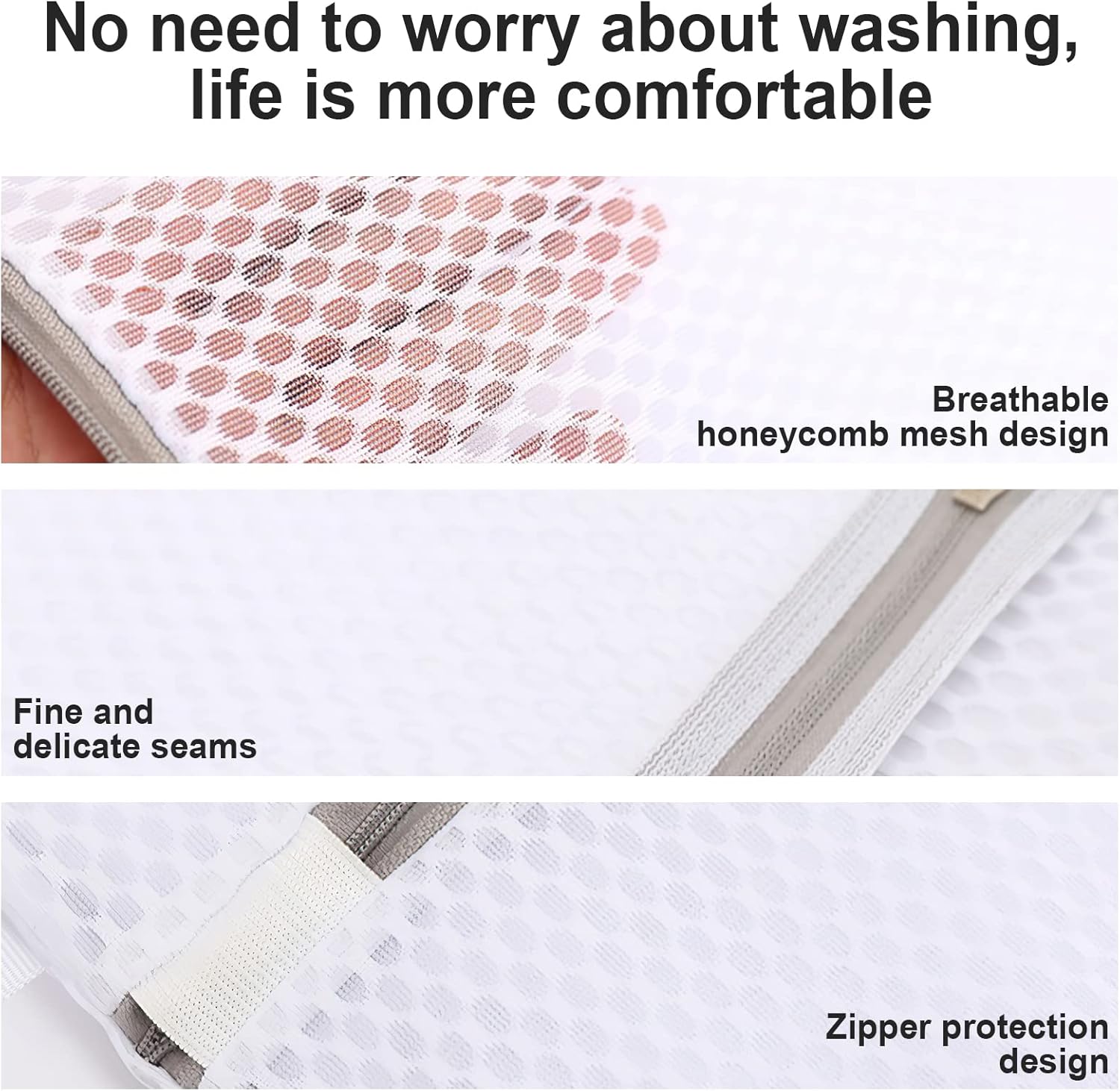 - 【Warm tips】 About 70% of the delicates laundry bag should be filled with clothes. Do not load the washing machine too full, it has a better decontamination ability when it is filled with 70% clothes. Please do not pull the zipper on the mesh laundry bags to the end to prevent the zipper from falling off.