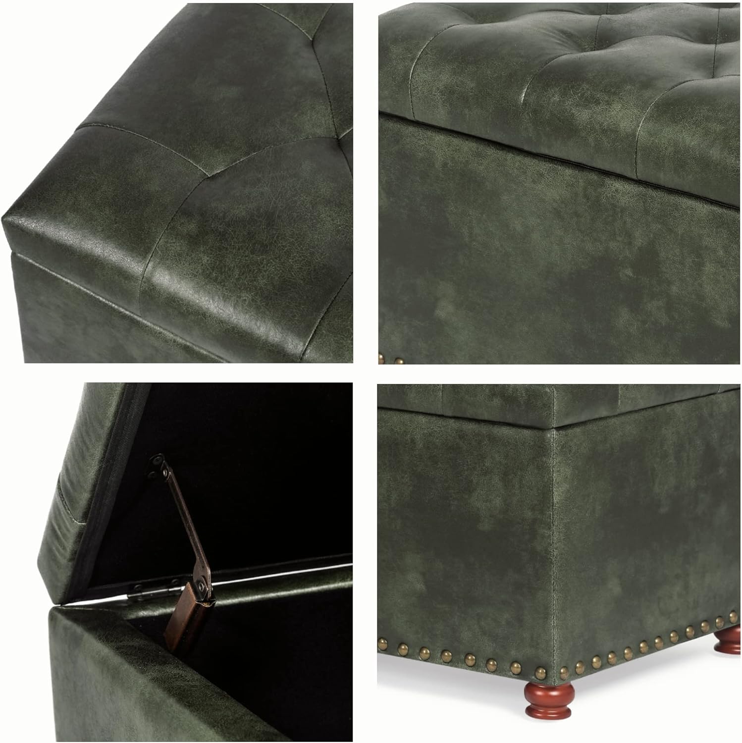 - ćVINTAGE STYLEćThe sturdy reddish brown wooden feet, the unique rivet decoration and the tufted design on the top of the lid make the ottoman full of retro style and look elegant and luxurious. This is a piece of furniture with good taste.