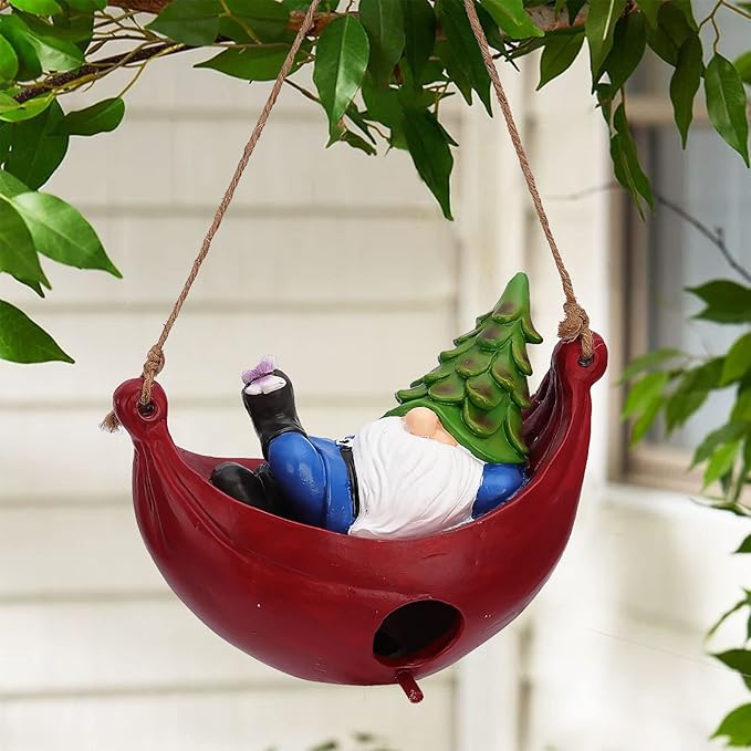 BAYN Bird House for Outside, Hanging Handcrafted Hammock Gnome Resin Outdoor birdhouses Humming Bird, Bluebird, Wren, Camper Hanging Houses nest cage