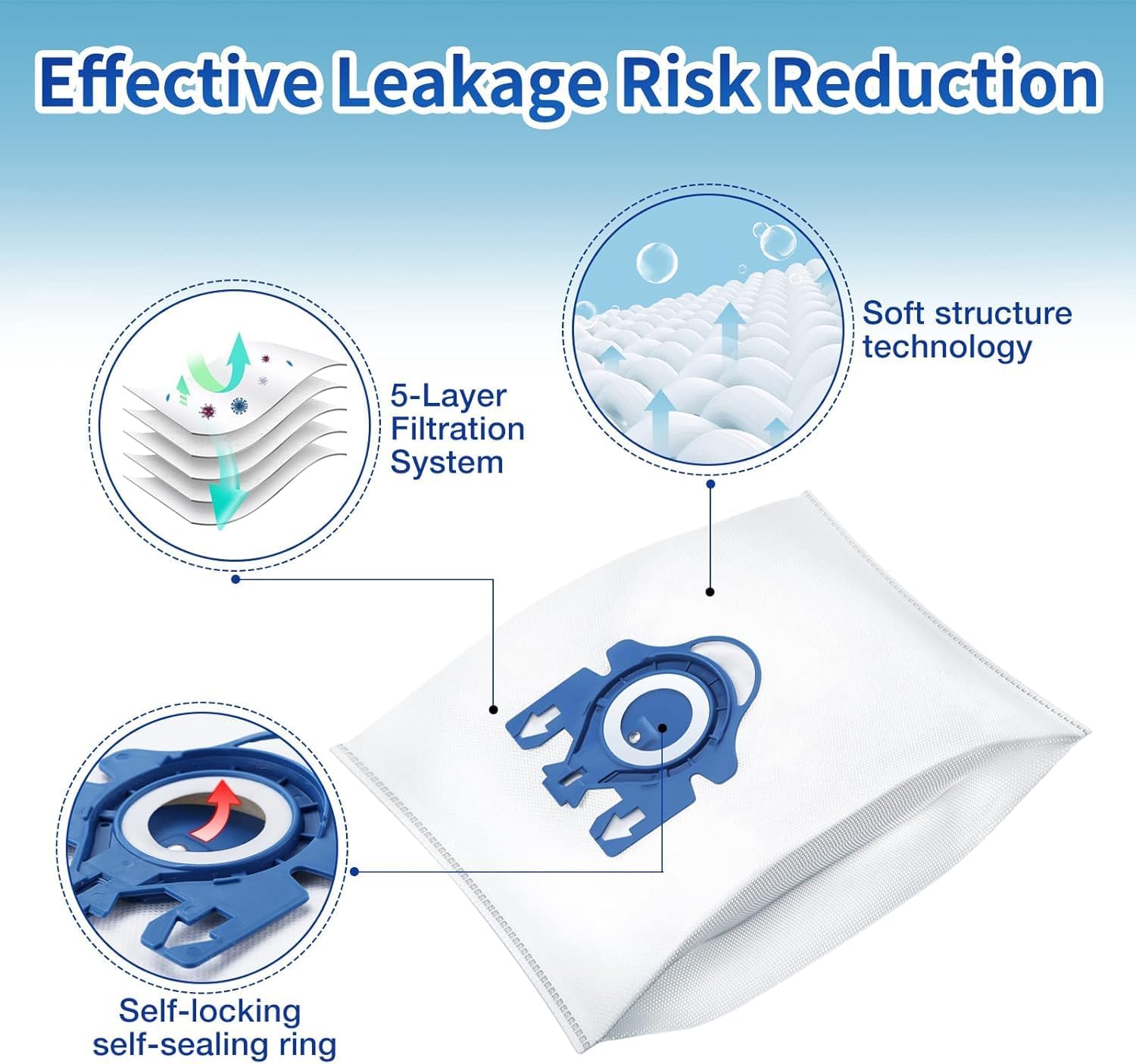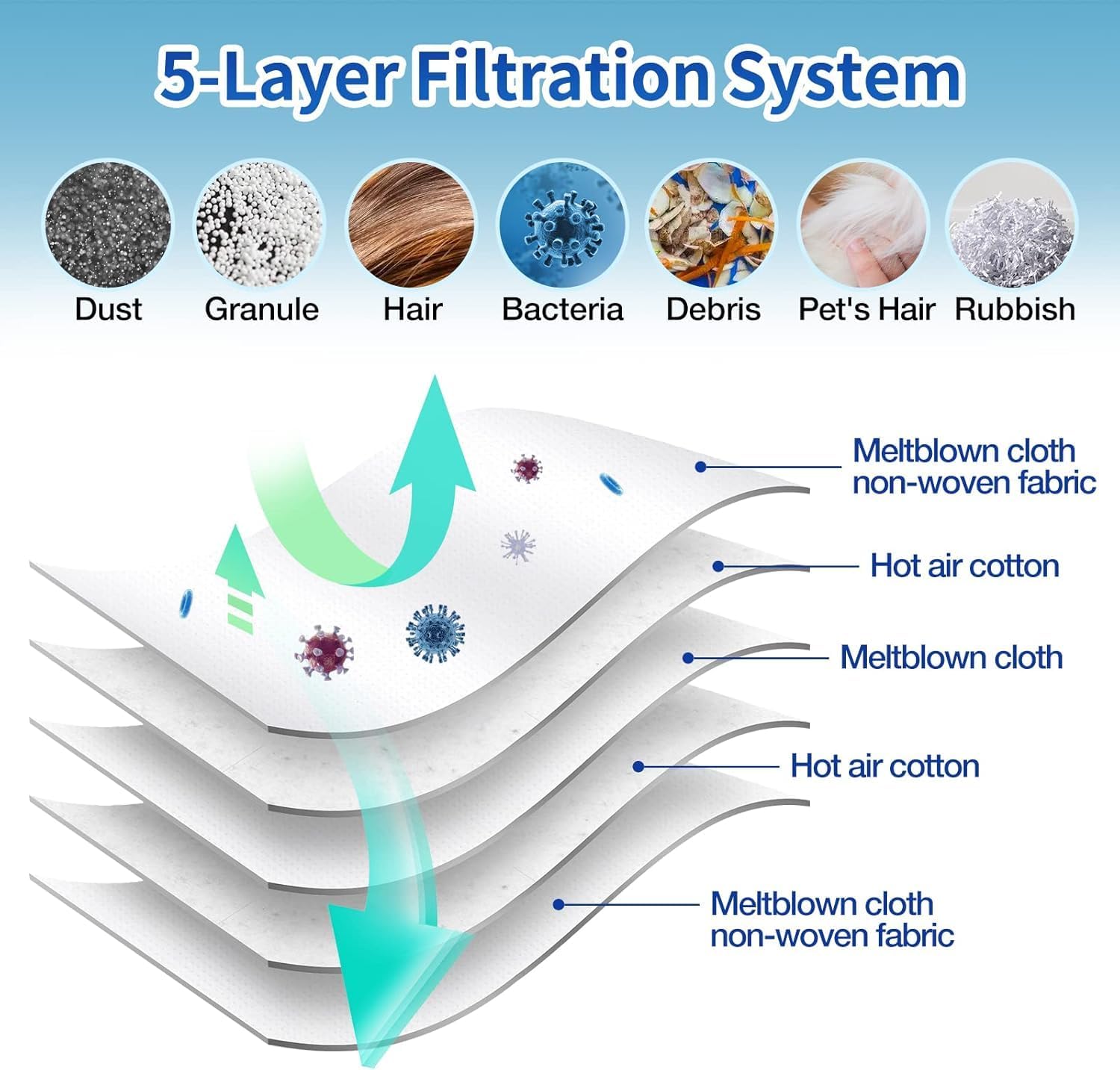 - [Excellent Adsorption]- Designed with a variety of high-quality materials, the 5-layer filtration system can effectively adsorb dust and debris. The self-locking self-sealing ring will automatically close when the bag is removed, effectively reducing the risk of air leakage. Ensure that the particles inhaled by the vacuum bag are not easily released into the air again.