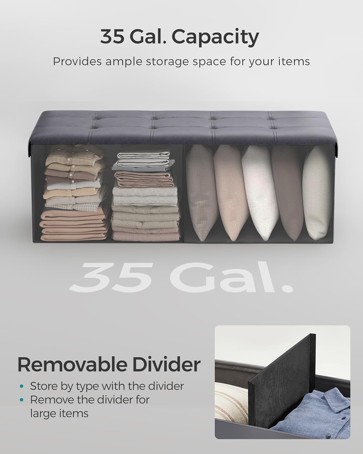 - ăOODLES OF STORAGEăUnfold this storage box, insert the sturdy base plate, and you have 35 gal. (131 L) space for storing bed linen, books, or clothing