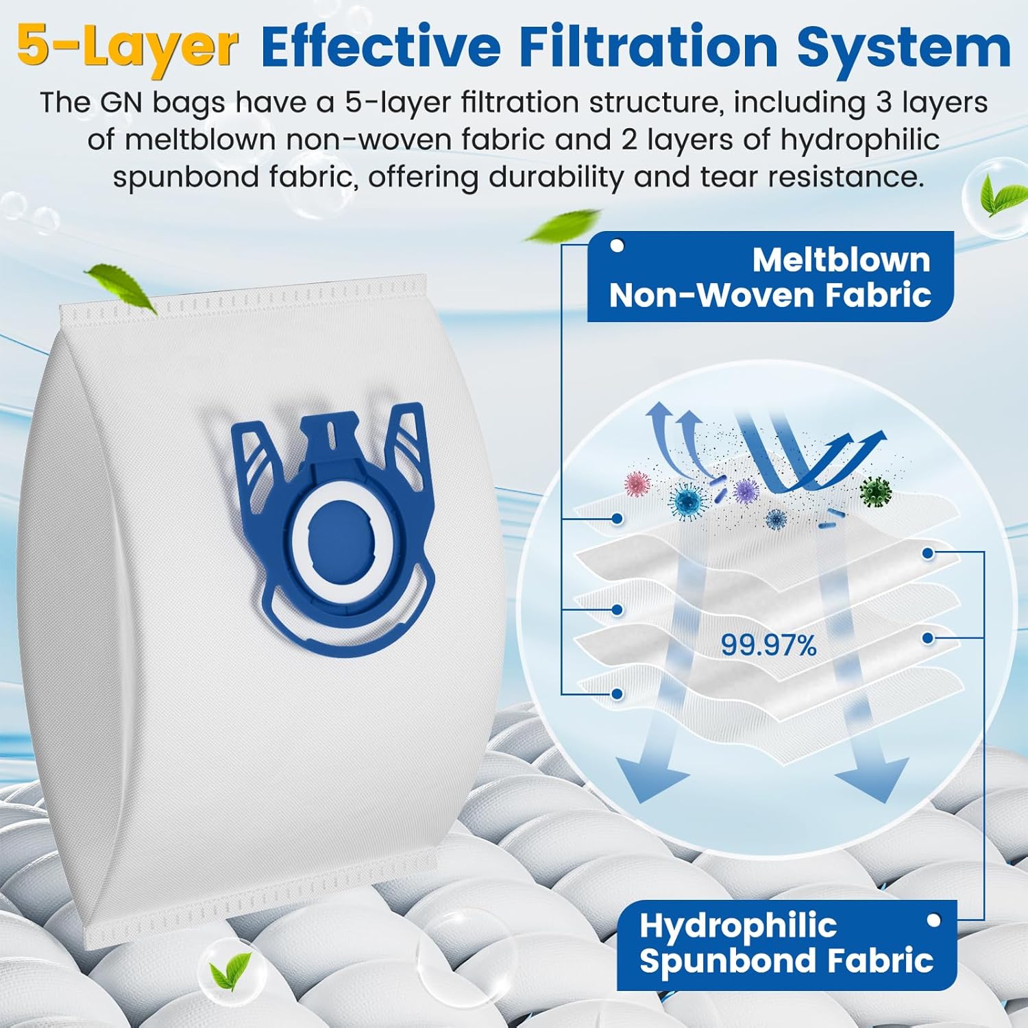 - Premium Material & Performance: The gn vacuum cleaner bag features a 5-layer micro+filtration system with higher filtration performance that captures 99.97% of dirt, hair, pet dander, etc., helping to keep your house truly tidy and improve air quality.