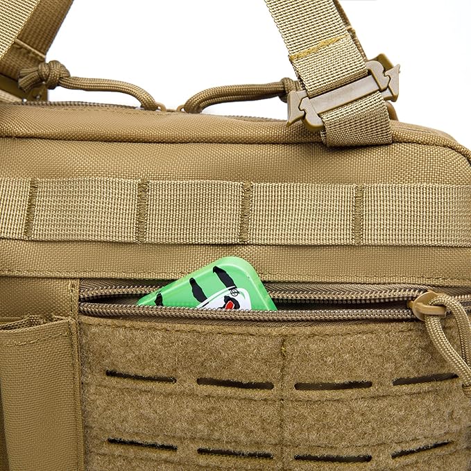 - UPGRADED PERFECT DESIGN :The front side of tactical admin pouch have phone pocket at the left side ,small pen holder pouch at the middle ,large molle laser cutting loop at the right side and zipper pocket at right corner to store your small necessary accessories. The large inner pocket have three lining pocket and Horizontal elastic loops allow you easily to take and store the glow stick, tactical pen, flashlight, and other stick shape tools.