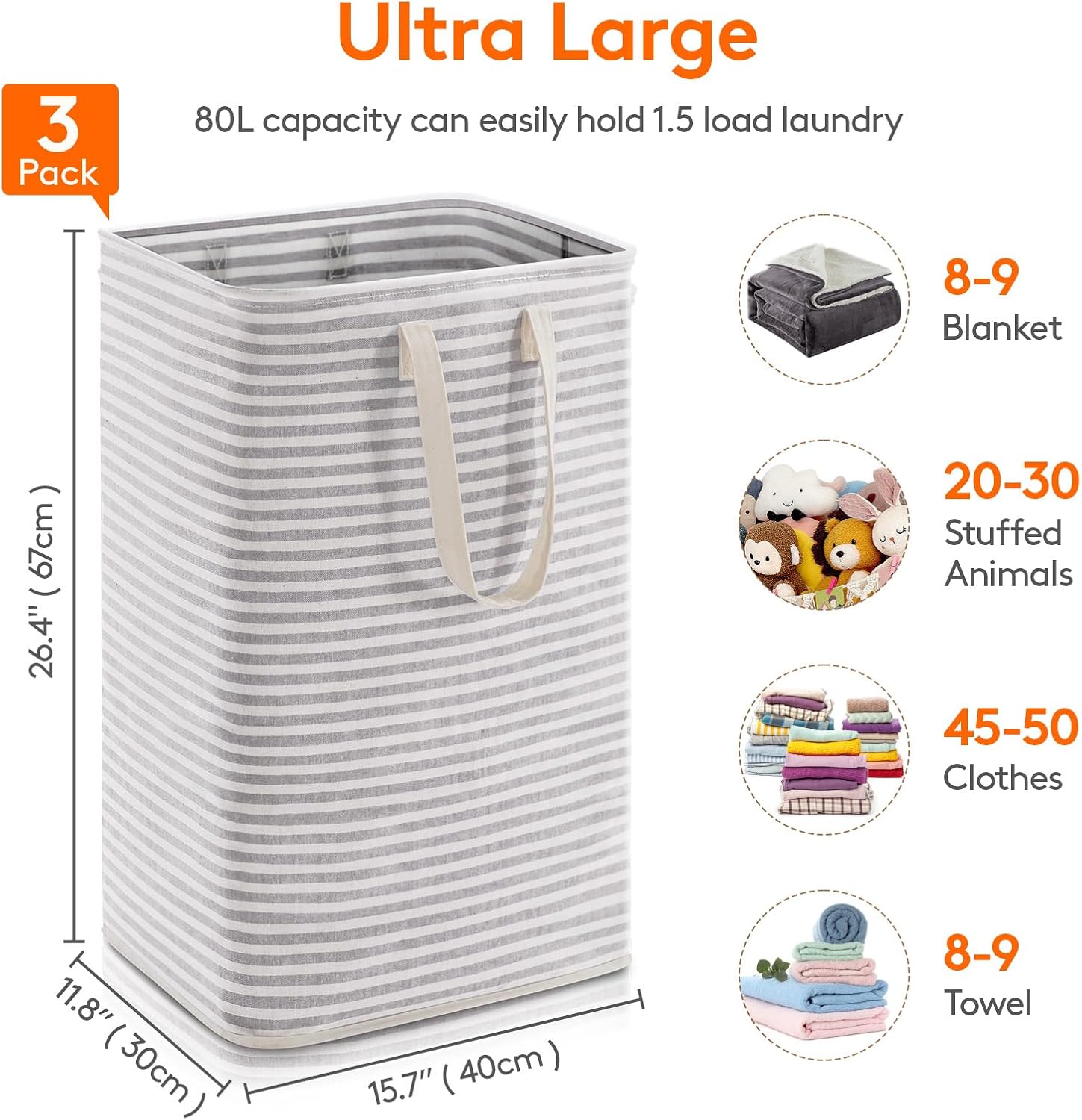 Lifewit 3 Pack Laundry Hamper Large Collapsible Laundry Baskets, Freestanding Waterproof Clothes Hamper with Easy Carry Handles in Laundry Room Bedroom Bathroom College Dorm for Adults, Gray, 3 x 80L