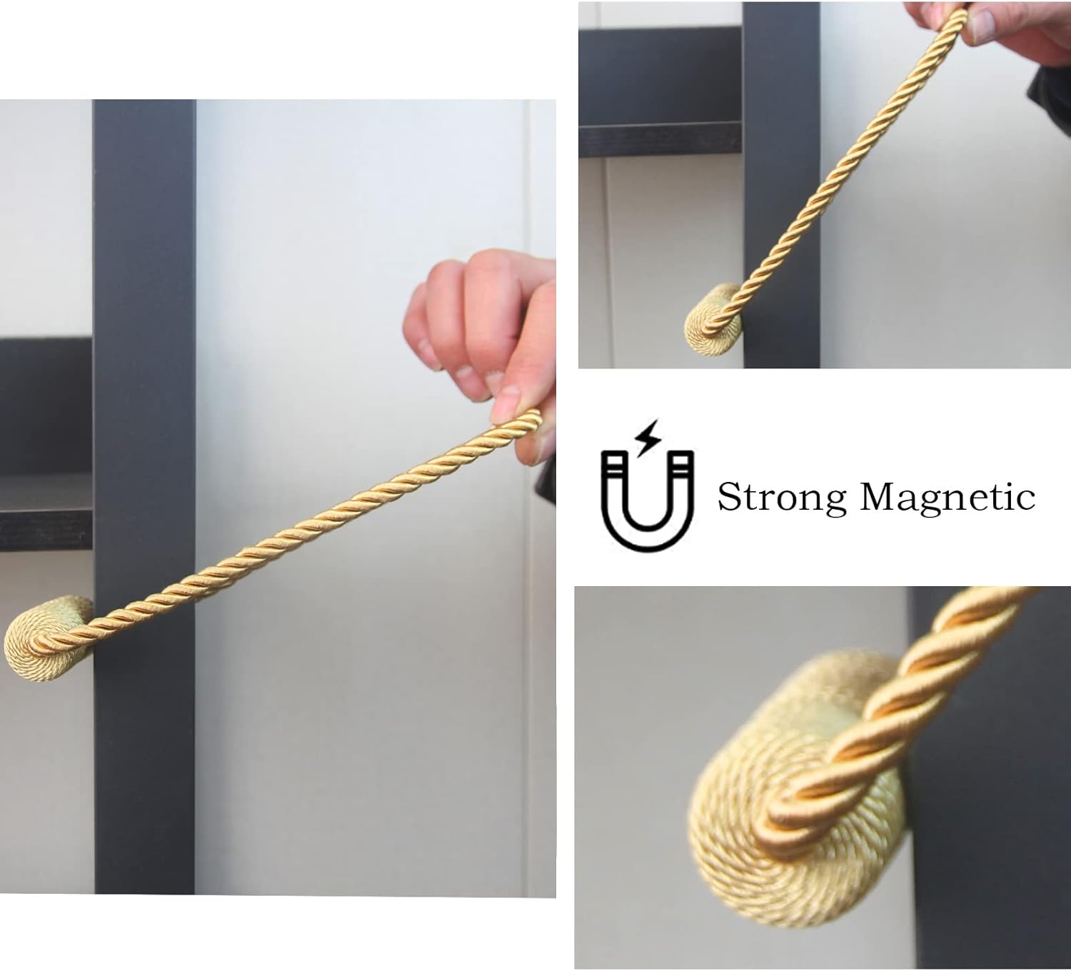- High-Quality Materials- Magnetic curtain tie backs use an upgraded version of nickel-plated magnets, which are strong and smooth. The brightly colored twisted woven โtexture rope is hand-woven with premium polyester materials. very soft and good feeling. Beige/Gold/Black/White/Grey/Khaki/Coffee/Blue -Eight colors to choose from