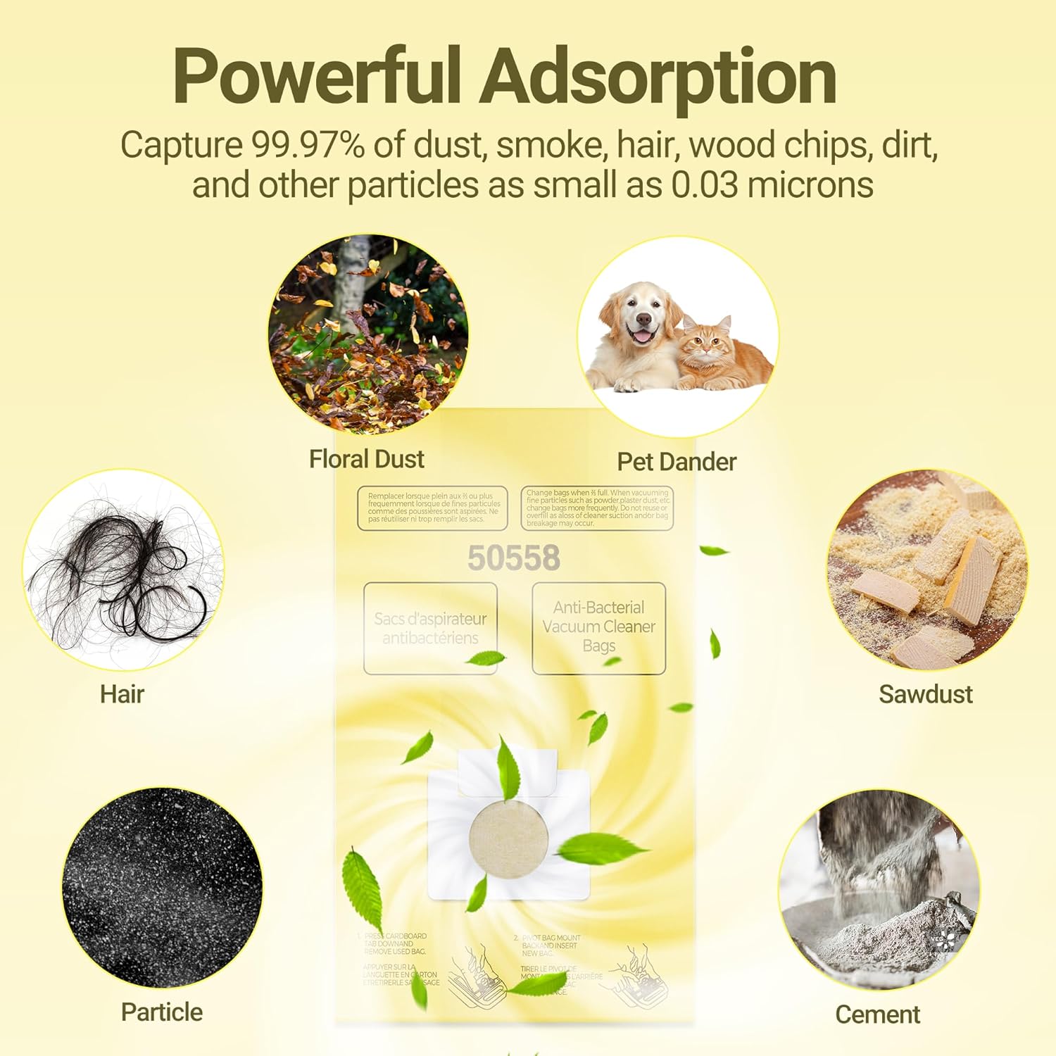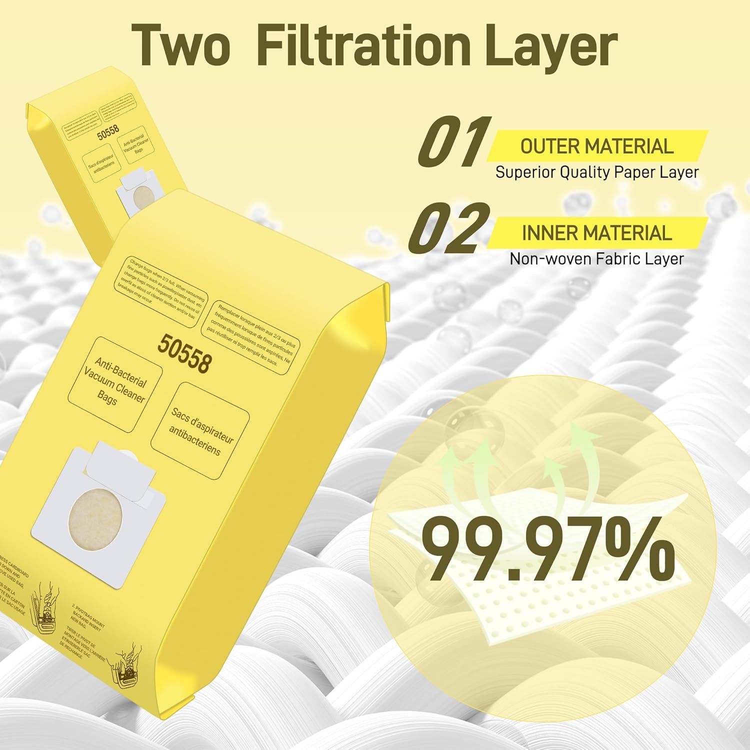 - 𝗣𝗔𝗦𝗧𝗘 𝗦𝗘𝗔𝗟𝗜𝗡𝗚 𝗥𝗜𝗡𝗚 𝗦𝗬𝗦𝗧𝗘𝗠 - Our 50558 canister vacuum bags adopt a paste sealing ring system that securely seal the opening of the bag, locking all dust securely in the vacuum bag to ensure that no dust or impurities leak out when the bag is replaced, providing a cleaner and healthier environment for you and your family