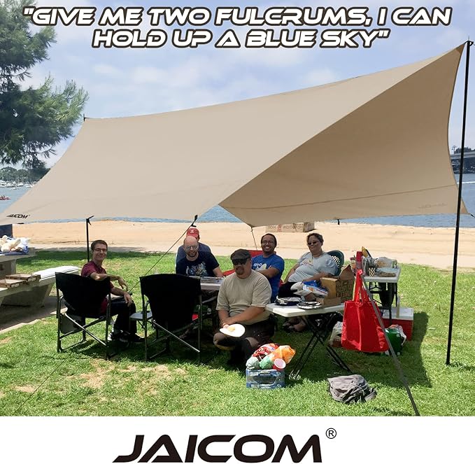 - EXTRA LARGE SHADING AREA: The JAICOM camping tarp has an unfolded size of 14 x 12 feet, providing a large shade area of approximately 215 square feet. It has a package size of 17.3 x 4.7 inches and weighs only 7 pounds, making it easy to carry and pack into a backpack to take anywhere