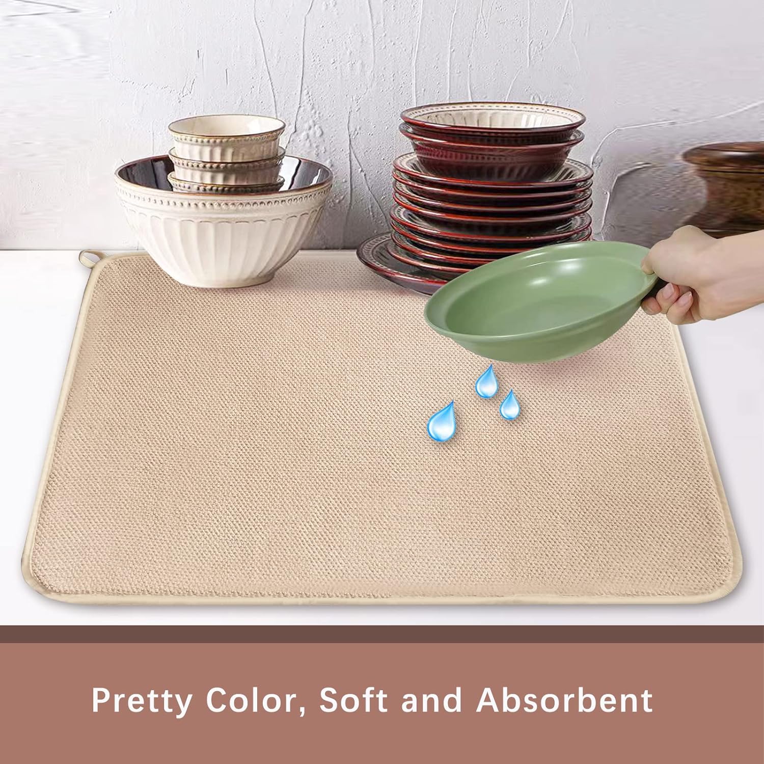 Dish Drying Mats for Kitchen Counter, 2 Pack Dish Drying Pads Dish Rack Mat Drying Pink Kitchen Mat (Beige-2)