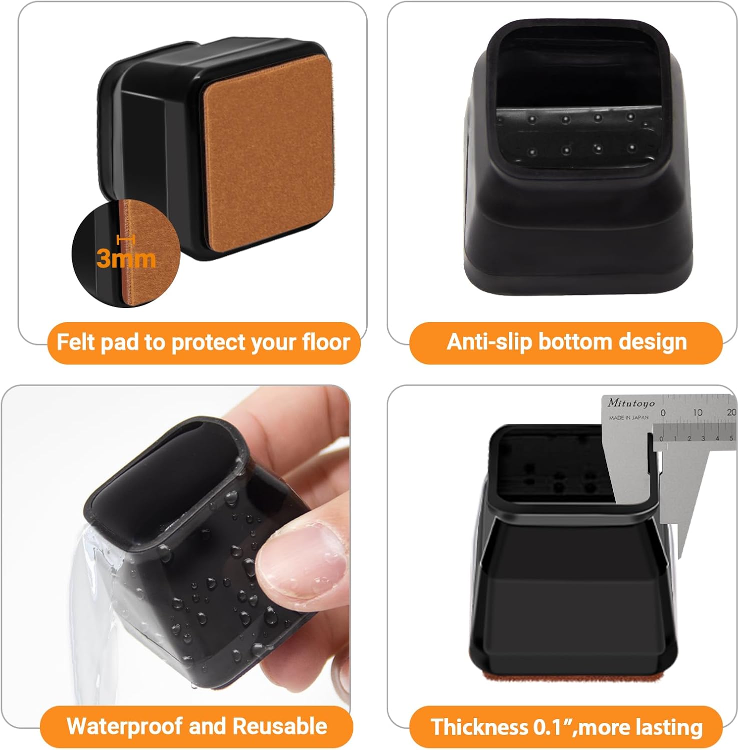 - APPLICABLE SHAPES AND SIZES: Our chair leg floor protectors only fit wooden square chair legs. Compared with the round chair leg caps, the square chair leg floor protector fits the square chair leg better. We have tow sizes chair leg protectors for hardwood floors.Please measure the size of your furniture feet before buying.The S size chair leg floor protectors square is suitable for square leg with side length 1" to 1-1/5"(25-30mm), irregular leg with perimeter 3-9/10" to 4-3/4"(100-120mm).