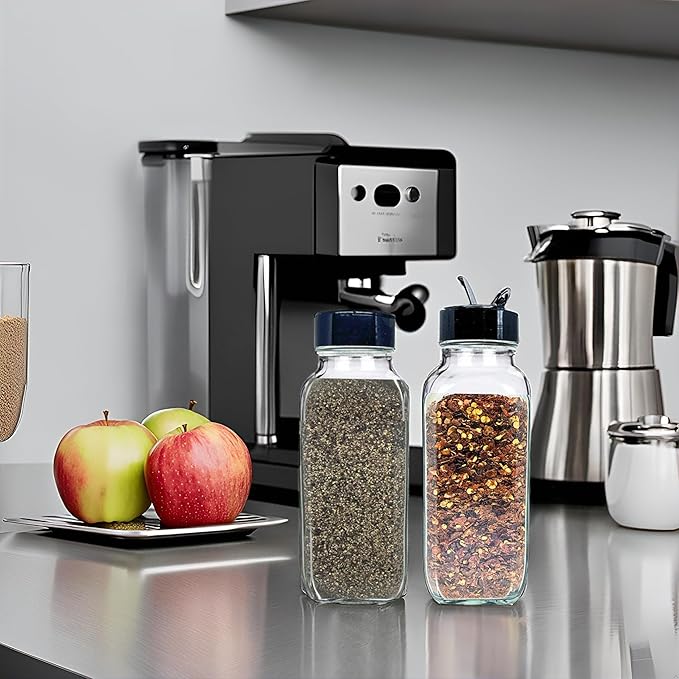 - DURABLE CLEAR GLASS DESIGN – Made from thick, lead-free glass for long-lasting use. Transparent body makes it easy to identify herbs, seasonings, salt, pepper, or baking ingredients at a glance.