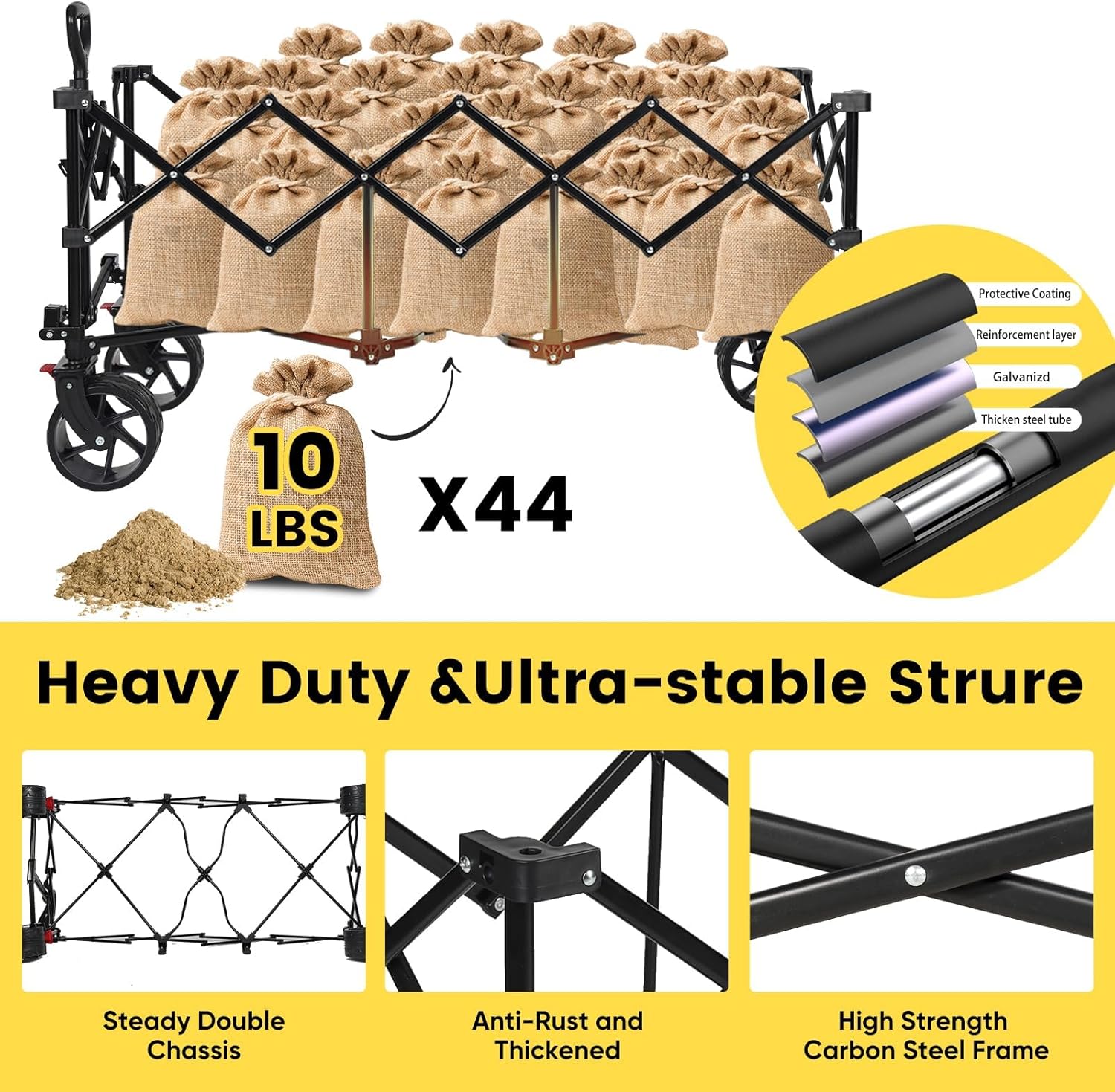 Sekey 48''L Collapsible Foldable Extended Wagon with 440lbs Weight Capacity, Heavy Duty 300L Folding Utility Garden Cart with Big All-Terrain Beach Wheels & Drink Holders. Khaki