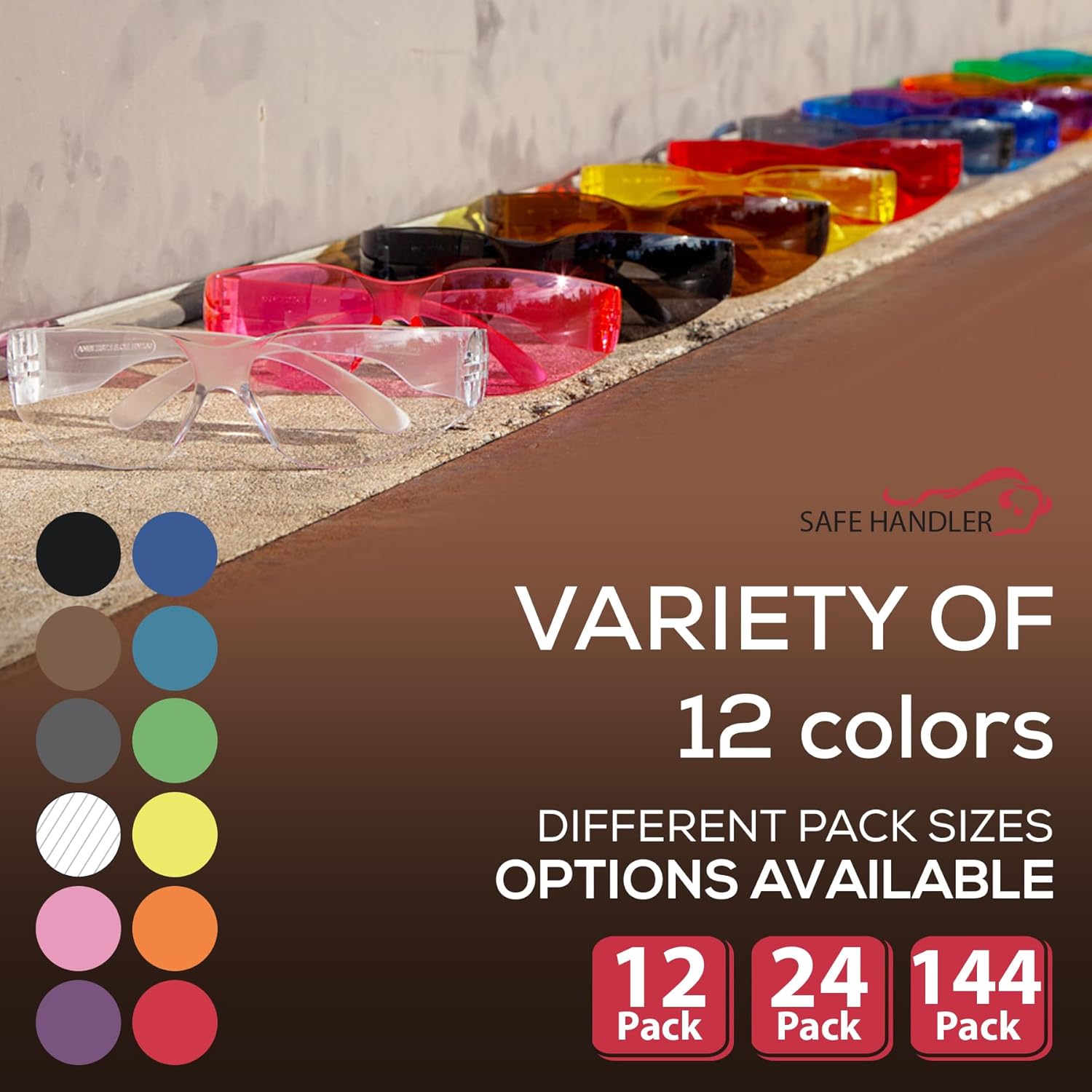 - SAFE HANDLER by Bison Life - Hyline Safety Glasses, Color Lens, Color Temple, 12 assorted colors in one box, 2 boxes (1 of each color: pink, red, orange, yellow, purple, green, black, turquoise, gray, blue, brown, clear) Bulk Case Pack of 24 PAIRS