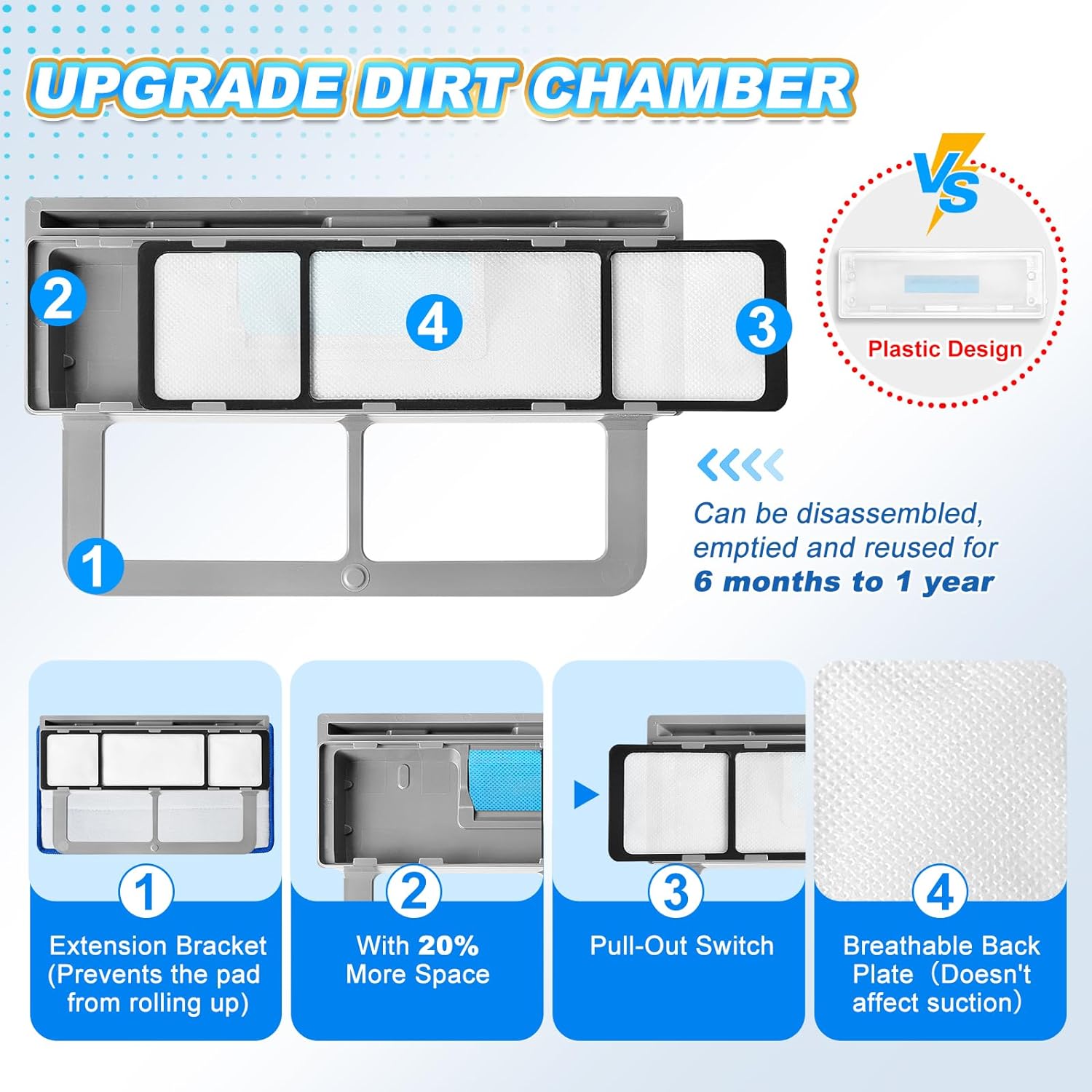 - SIGNIFICANT IMPROVED & TRULY REUSABLE : Mop with washable pads compatible with shark vacmop replacement pads with upgraded dirt chamber has 20% more space to collect more dirt and dust than the original. The frame is more stable, the Velcro on the frame grabs compatible with shark vacmop pads very securely keeping the mop pads refills in place all of the time, made of ABS material, which is more durable and long-lasting than other plastics, you only need to replace the filter and vacuum mop pads refill every 1-3 months