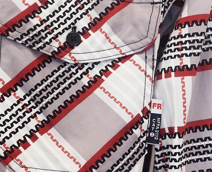 - FR MATRIALS:6.5OZ Printed Plaid Cotton Twill FR Treated,FR Buttons,FR Sewing Threads!Clear FR Tag on arms and bottom front.More FR info On Tag About UL Certification.