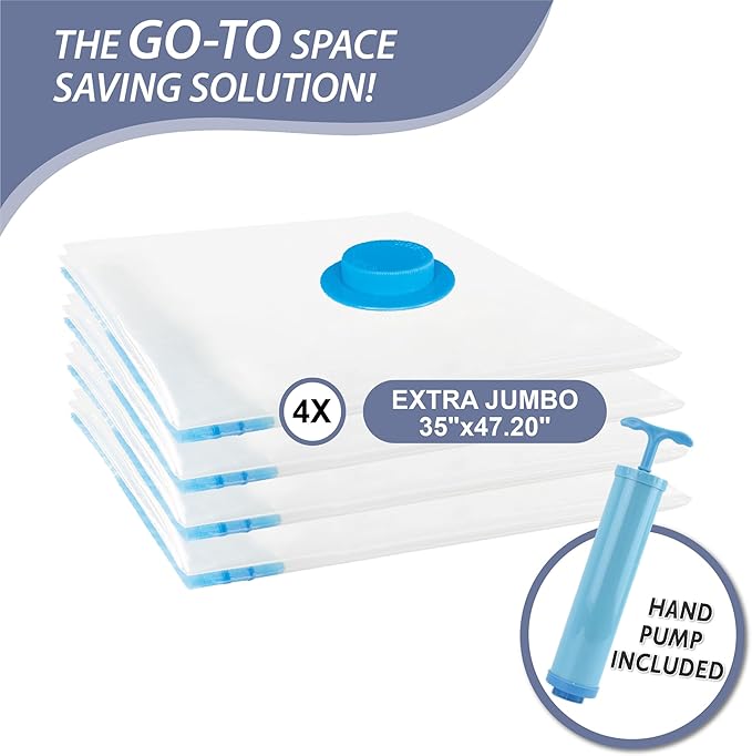 - 4 Pack Includes: 4 Pack XXL Bags (47.2x35 in) XXL jumbo storage bags; Whether you are in the midst of storing or relocating, these jumbo vacuum bags totally change the game