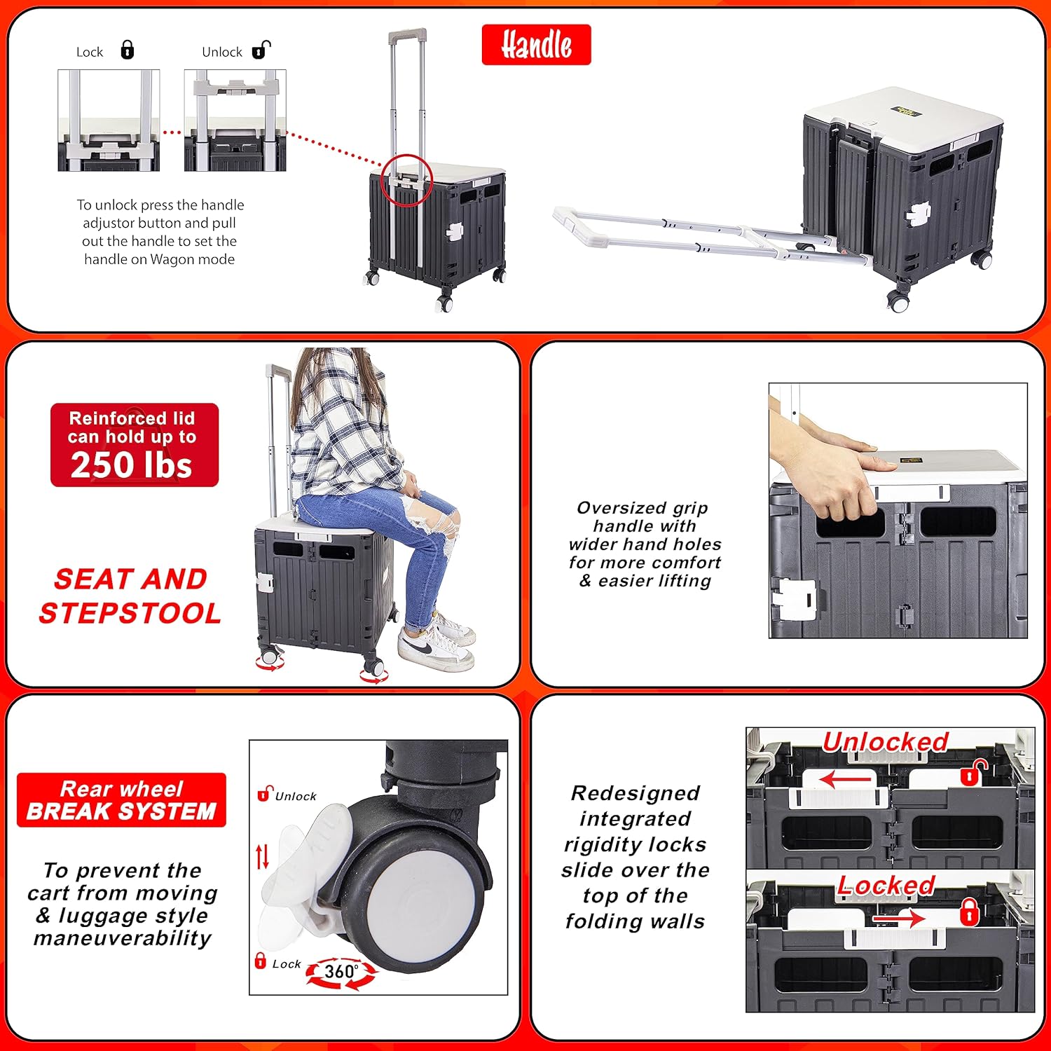 dbest products Quik Cart Swing Lid Four Swivel Wheeled Rolling Crate Teacher Utility with seat Heavy Duty Collapsible Basket with Dual Telescopic Wagon Handle