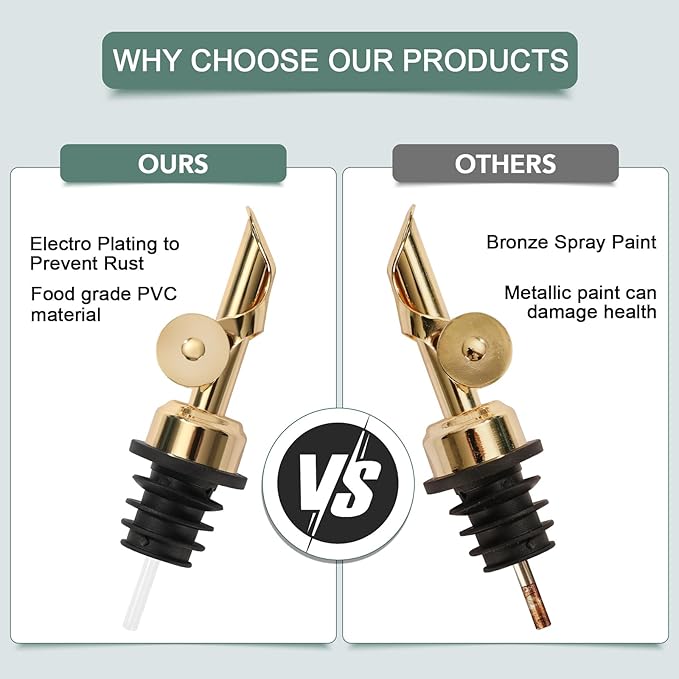 - 【Metal spout design】Each metal nozzle is made of the highest quality metal, durable and lightweight, making it easy to control the speed at which liquid is poured. The opening in the spout automatically opens and closes to prevent liquid leakage, eliminating the need to tighten it, making it a useful tool in the kitchen.
