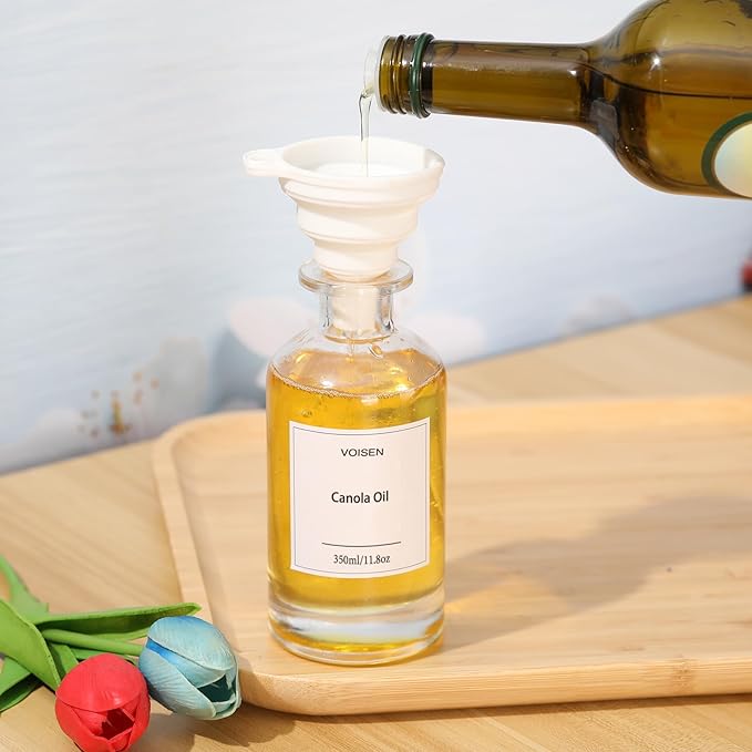 - 【Package Includes】Olive oil dispenser set includes 6 high quality 11.8oz (350ml) Glass Oil Bottles, 6 gold weighted self closing spouts, 56 pre-set labels, 1 collapsible food grade silicone funnel,cooking and home essentials.
