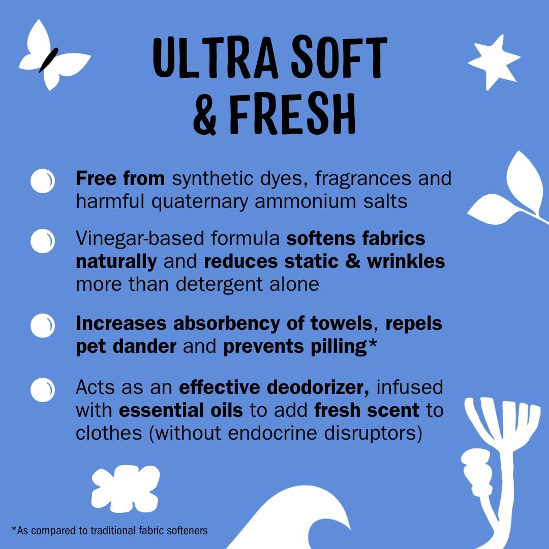 - SOFT, STATIC FREE CLOTHES: Unlike traditional fabric softeners that can deposit residues on clothes, Molly’s Suds vinegar-powered Fabric Softener uses simple ingredients (no harmful quaternary ammonium compounds!) to leave clothes feeling fresh, cozy, and comfy. Ideal for sensitive skin, the planet, and all washing machines. Our clean formula reduces static and wrinkles more than detergent alone, so you and your family can look and feel your best.